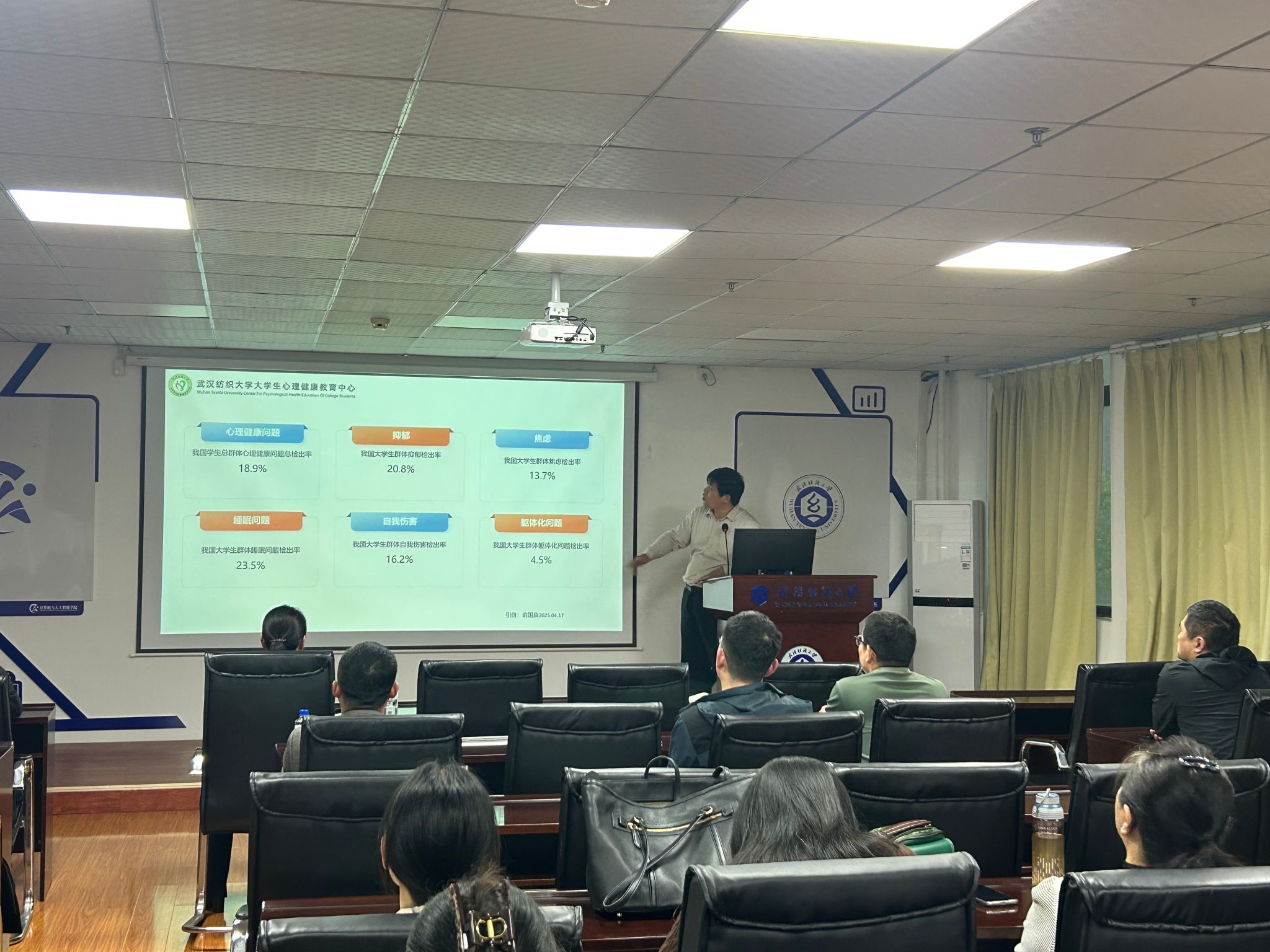 培训会上,赵宝富老师结合高校学生心理健康工作实际,围绕心理健康常见症状识别、心理危机应急处置流程、师生谈心谈话技巧、家校社协同育人机制等核心内容展开系统讲解。他结合近年来高校发生的典型心理案例,用通俗易懂的语言拆解复杂的心理知识,深入分析学生心理问题产生的根源、发展规律,以及不同阶段心理危机的预警信号,让在场教师对心理健康教育有了更直观、更深刻的认知。