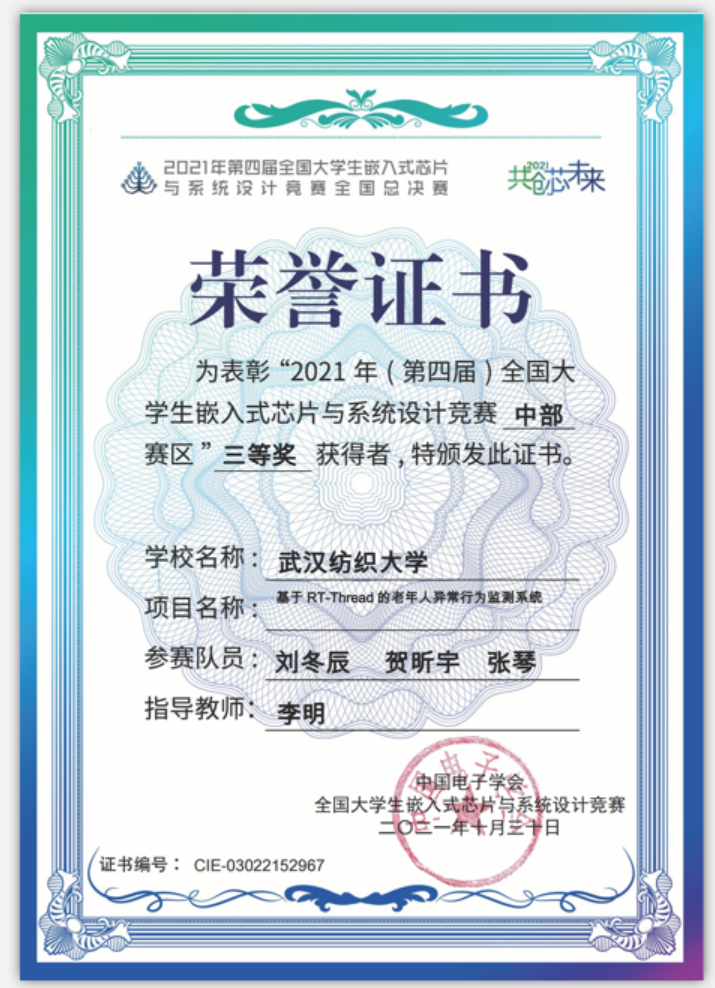近日,第四届全国大学生嵌入式芯片与系统设计竞赛因疫情防控需要,在线上进行了决赛。经ok138cn太阳集团529李明副教授指导,由19级本科生刘东辰、贺昕宇、张琴组成的参赛队伍完成了“基于RT-Thread的老年人异常行为检测系统”,荣获了三等奖。