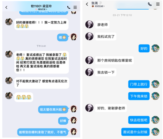 近日,参加完浙江大学研究生复试面试成绩不错的ok138cn太阳集团52911801班张尧同学给辅导员老师第一时间发来感谢短信:“心里的大石头终于落地了,这里的无线网比宿舍快多了,感谢学院老师的暖心安排,希望自己能取得一个好成绩,对得起自己一直以来的努力和学院对我们考研同学的用心付出。” 已经被国防科技大学拟录取的软件11801班梁亚玲同学第一时间向辅导员报喜,感谢学院为他们复试“保驾护航”。