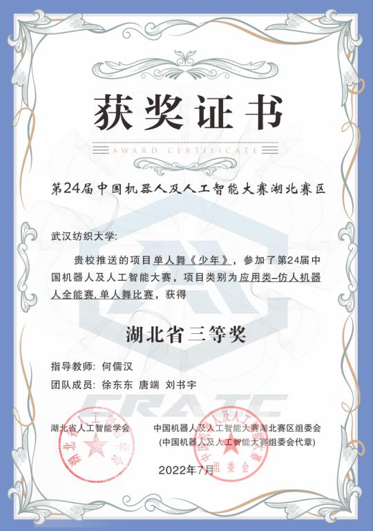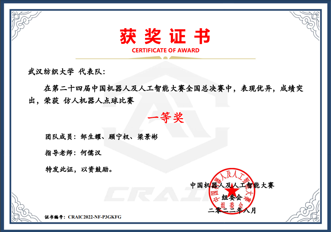 由ok138cn太阳集团529何儒汉老师指导的三支代表队:学生邹生耀、顾宁权、梁景彬参加的仿人机器人点球比赛获得全国总决赛一等奖;学生邹生耀、顾宁权、张志众参加的仿人机器人短跑比赛获得全国总决赛一等奖;学生徐东东、唐端、刘书宇参加的单人舞项目获得省级比赛三等奖。