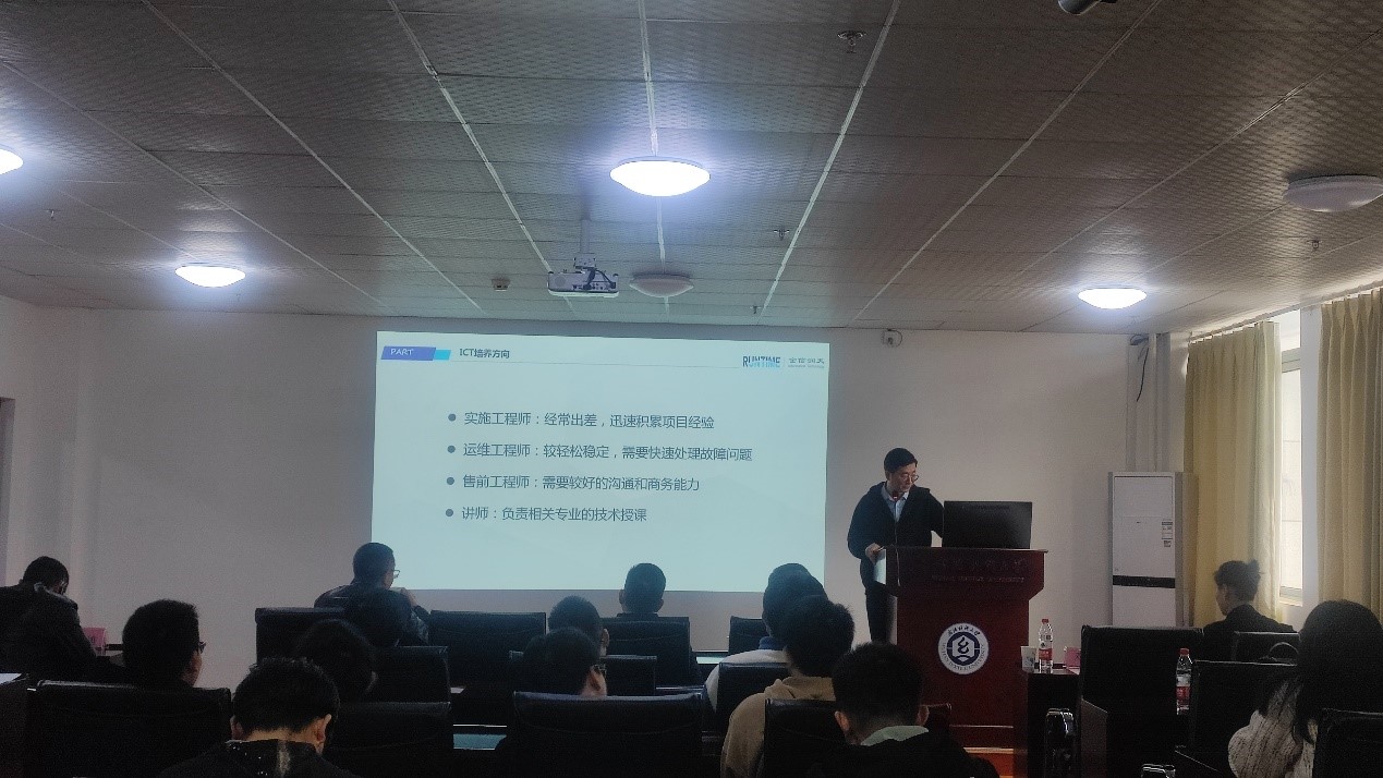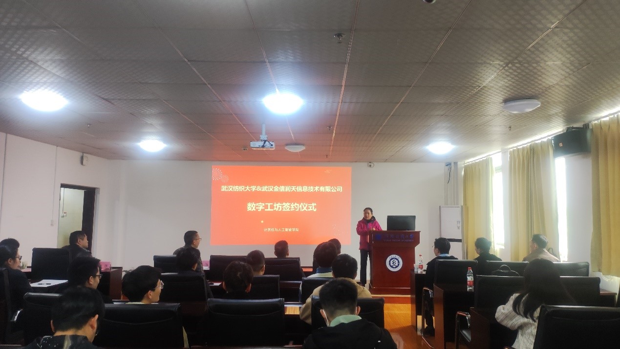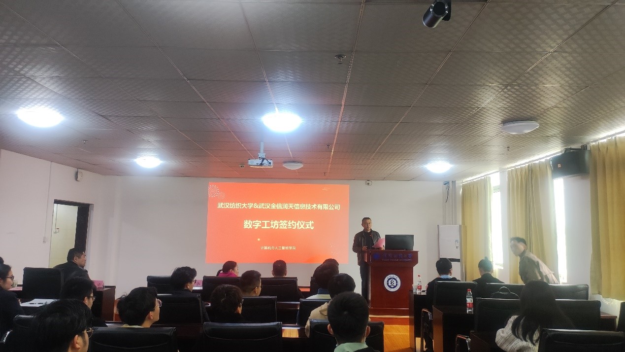 武汉金信润天信息技术有限公司总经理夏振兴、教学经理邓方鸣分别介绍企业和行业的发展现状、“数字工坊”工作开展情况,并提出对“数字工坊”建设的具体工作思路。