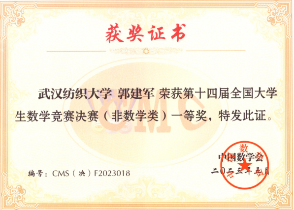 郭建军同学以学为业,学以致用,他以优异成绩在去年11月底的湖北赛区的初赛中冲入决赛。顶层设计,把舵定向,从去年12月初到参加决赛前,指导老师为郭建军精心设计学习计划,严格落实学习任务,专心做好教学辅导,为此次获奖奠定了扎实基础。郭建军作为湖北赛区的23名选手之一晋级到全国决赛,在全国决赛中,沉着应战、稳扎稳打,最终取得全国一等奖,尽显我院“美在纺大,学在计算机”的优良学风。