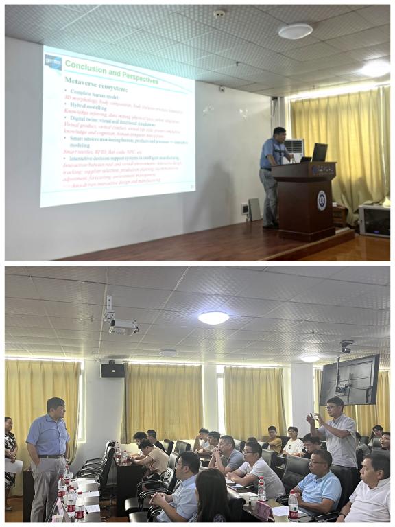 报告中,曾宪奕教授分享了纺织智能制造的设计和实操流程。指出当前工业元宇宙对制造业已经产生十分深远的影响,学习这个前沿生态系统及其在改变工业世界中的角色,有助于更全面的开展智能制造科研、设计以及工业生产等工作,并就工业元生态系统在智能制造和产品设计方面的潜力和挑战与在场师生进行深入交流。