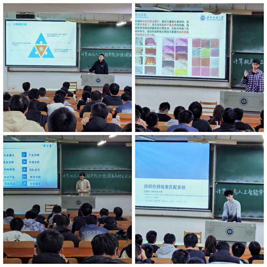 此次报告中,软件12103班的王际豪同学围绕其所在本科生课题组正在开展的大创项目,以“多色纺织面料区域分割方法研究”为题,为2022级本科生介绍了其所在本科生创新团队围绕面料换色研究,在多色面料分割方向开展的方法调研和实验情况,汇报了近期创新研究成果。软件12101班吴秉臻同学围绕其所在的本科生创新团队所开展的面料检索系统研发进行报告,重点介绍了创新团队在面料检索系统搭建、面料检索算法设计、以及目前团队面向色纺面料检索所取得研究进展,介绍了团队目前搭建的照相建库系统,展示团队取得的软著和专利成果。物联网12102班的田岑同学对该团队搭建的面料检索系统进行了现场演示,并向同学们从大赛背景介绍、大赛目的与意义、参赛资格与参赛对象、评审标准与评分细则、以及个人参赛认知等方面,详细解读了“互联网+”大赛的具体情况,鼓励师弟师妹们积极加入学科竞赛团队。软件12101班的陈炳齐同学,针对今年在“互联网+”大赛的参赛项目“布小匠——复杂色彩织物精准测色关键技术与装备”进行了详细汇报,并针对本项目参赛的商业计划书进行了分析,依托本项目的讲解,对“互联网+”大赛的比赛规则进行了进一步的解读。据悉,该项目目前已注册公司,并在2023年的“互联网+”大赛获得了校级金奖和省级铜奖,项目团队成员将继续打磨商业计划书,继续完善各项参赛材料,争取在2024年的“互联网+”大赛中更进一步。