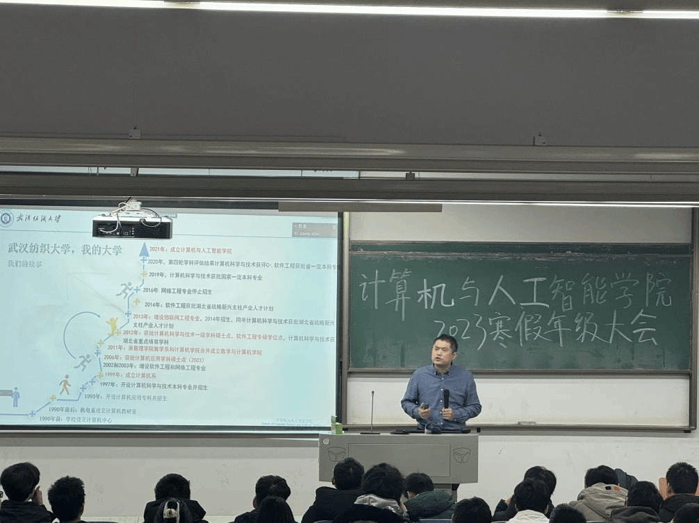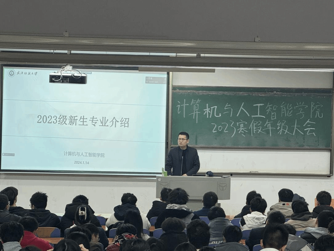 为总结分析2023级新生大一上学期的整体情况,帮助学生充分了解所学专业信息,更好的利用寒假时间,做好专业学习规划。ok138cn太阳集团529于1月14日在三号教学楼T202召开2023级寒假年级大会,副院长魏雄、学院党委副书记向涛、辅导员易凡、陈祯及2023级全体学生参会。会议由向涛主持。