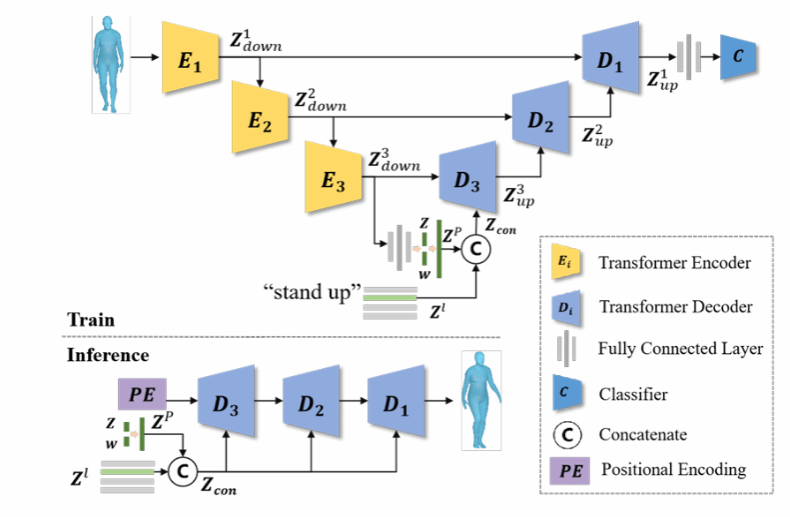 《Human Motion Generation Via Conditioned GMVAE With TUNet》由杜小勤副教授指导完成。论文提出了一种基于高斯混合模型和transformer U-Net(TUNet)的人体动作生成方法(CGMVAE-TU),该方法将隐空间建模为高斯混合分布,并推导出新的变分下界(ELBO)。为了增强模型的表现力,增强各个子高斯分布的区分度,使用费雪判别式(Fisher discriminant)作为正则化。最后,还提出了一种改进的注意力机制并应用于TUNet,仅利用动作标签就能生成与语义信息相对应的动作。在各种数据集上对所提出的 CGMVAE-TU 模型进行了评估,几乎所有指标上都超过了 SOTA,生成的人体动作逼真自然。