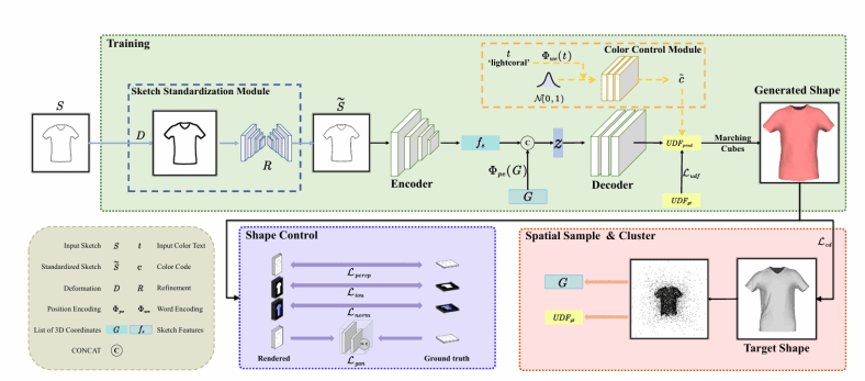《SGM:A Dataset For 3D Garment Reconstruction From Single Hand-Drawn Sketch》由陈佳教授指导完成,论文提出了一个大规模的三维服装模型数据集——SGM(Sketch-Garment Models), 包含了从36个不同视角渲染得到的5种类别服装的渲染图,包括草图、轮廓图、剪影图、深度图和法线图。在SGM的基础上,本文构建了一个端到端的重建网络,该网络能够直接从输入草图生成能够忠实表示输入草图形状的高保真的服装三维模型。最后,本文在SGM及现有的服装三维模型数据集中进行了多样性的评估,实验结果表明,本文提出的重建方法在视觉效果和定量指标上均取得了最佳表现。
