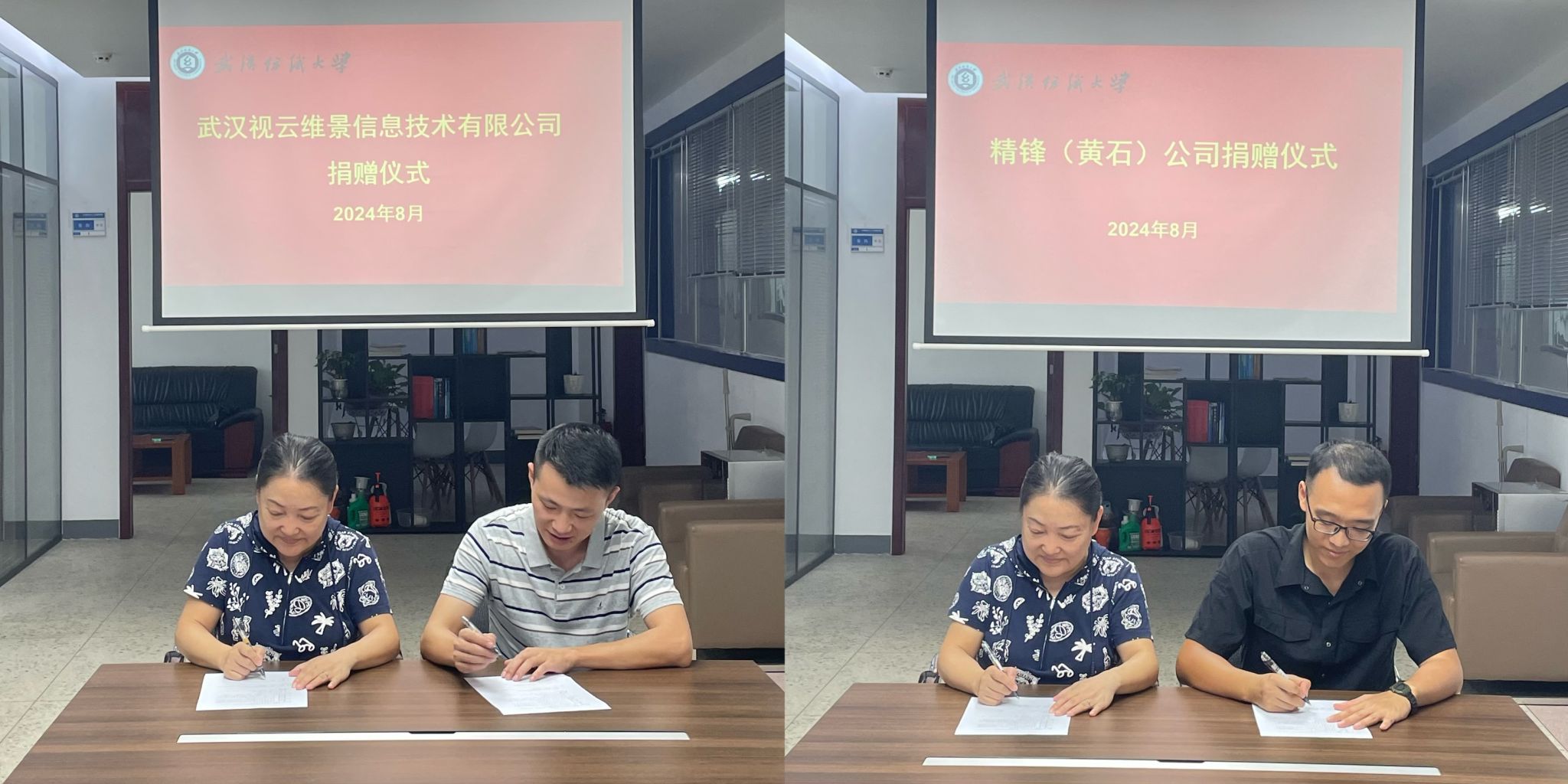 捐赠仪式上,黄毅代表武汉视云维景信息技术有限公司向学校教育发展基金会捐赠人民币400万元,陈伊驰代表精锋(黄石)公司向学校教育发展基金会捐赠人民币200万元,均主要资助计算机学科的学科建设和人才培养等方面。我院院长胡新荣与双方现场签署了捐赠协议。随后,双方就后续合作事宜进行了深入细致的沟通。
