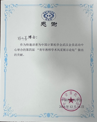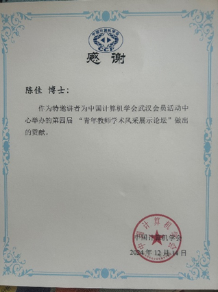 2024年12月14日由CCF武汉会员活动中心(简称:CCF武汉)主办,武汉科技大学承办的CCF武汉第四届青年教师学术风采展示论坛在武汉科技大学黄家湖校区举行。CCF武汉自2012年11月24日成立之日起,始终秉承学会和会员活动中心的使命与愿景,在“家门口”为武汉以及周边地区会员服务。本次主办的青年教师学术风采展示论坛由华中科技大学郑渤龙教授和武汉理工大学袁景凌教授担任主席,汇聚了来自武汉大学、华中科技大学、武汉理工大学、华中师范大学、华中农业大学、中国地质大学(武汉)等6所部属高校和武汉科技大学、ok138cn太阳集团、湖北工业大学、武汉工程大学等4所省属高校共13名青年教师。论坛上,我院教师陈佳教授和青年博士胡开喜分别报告了AI赋能发展新质生产力的前沿产业应用和顶级期刊会议上的最新研究成果,与各位青年学者展开了积极的讨论。