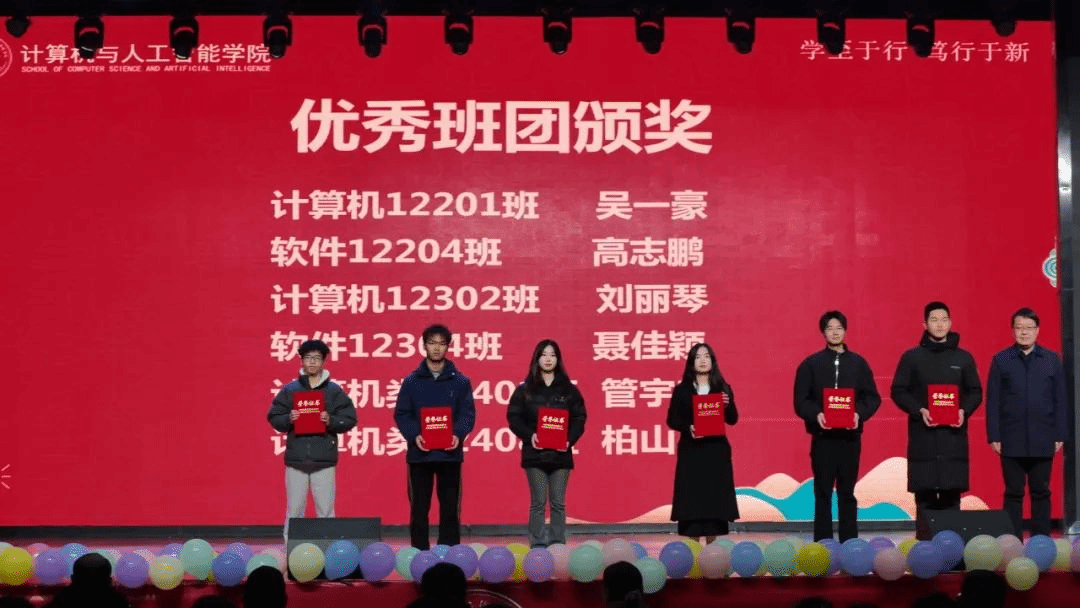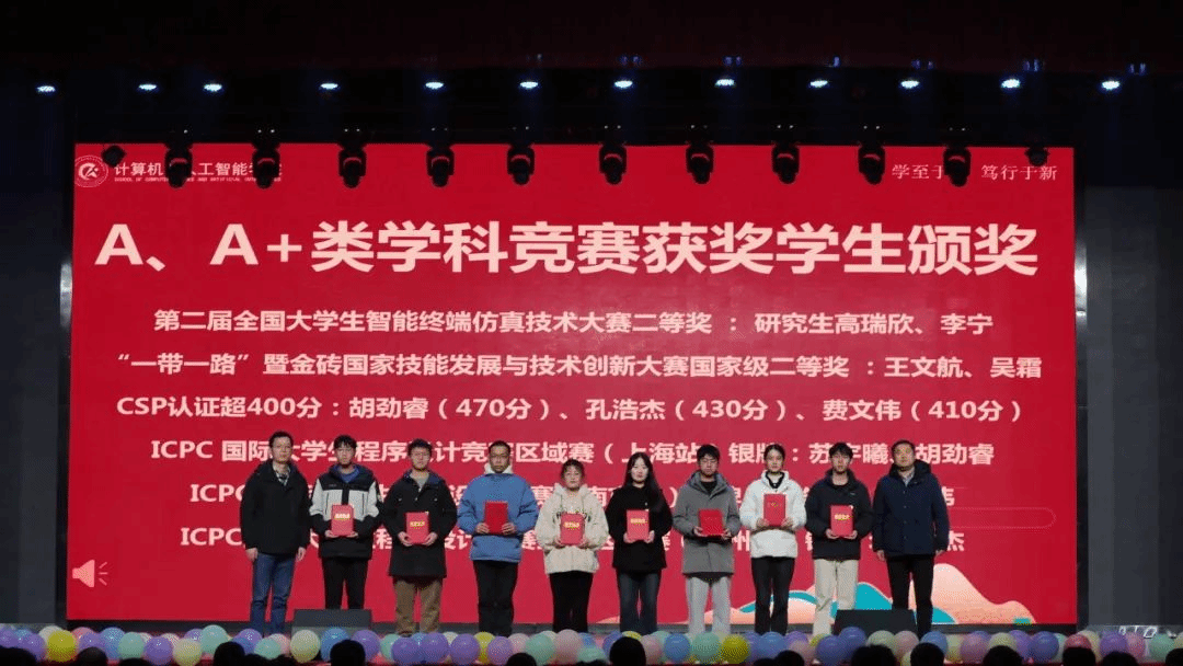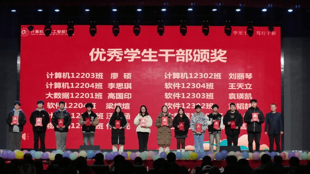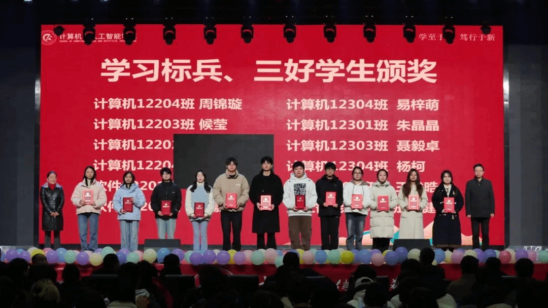 随后,大会依次对优秀班团、优秀学生干部、学习标兵、三好学生以及在A类、A+学科竞赛和CSP高分学生进行了表彰。颁奖环节气氛热烈,获奖者们在全场师生的掌声中上台领奖,彰显了计智学子的卓越风采。