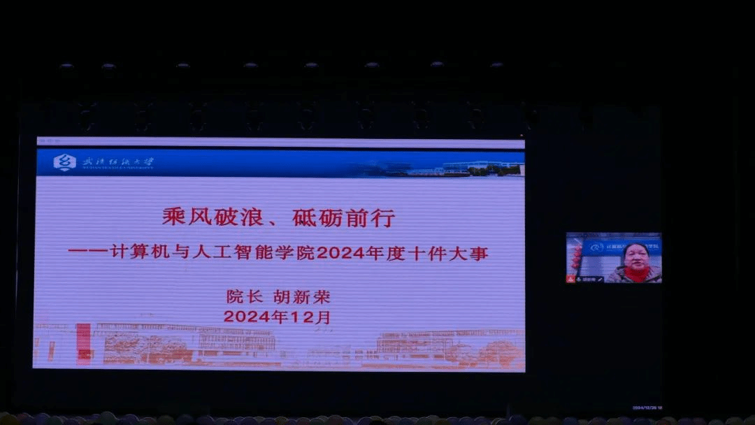 全体师生共同观看了《学院十件大事》视频,学院院长胡新荣教授用“十件大事”的形式总结了学院过去一年的辉煌成就,包括在人才培养、科研项目、专业建设、党建宣传等方面取得的突破性进展。她对学院师生的努力表示高度肯定,并对全体同学提出四点希望:一是希望大家追求卓越、勇于担当,将个人发展融入学院和国家建设;二是希望大家勤学笃行、踔厉奋发,注重实践与综合素质提升;三是希望大家精炼技艺、开拓创新,以过硬本领和创新思维应对时代挑战;四是希望大家凝心聚力、再创佳绩,传承纺大精神,为学院和学校发展贡献力量。