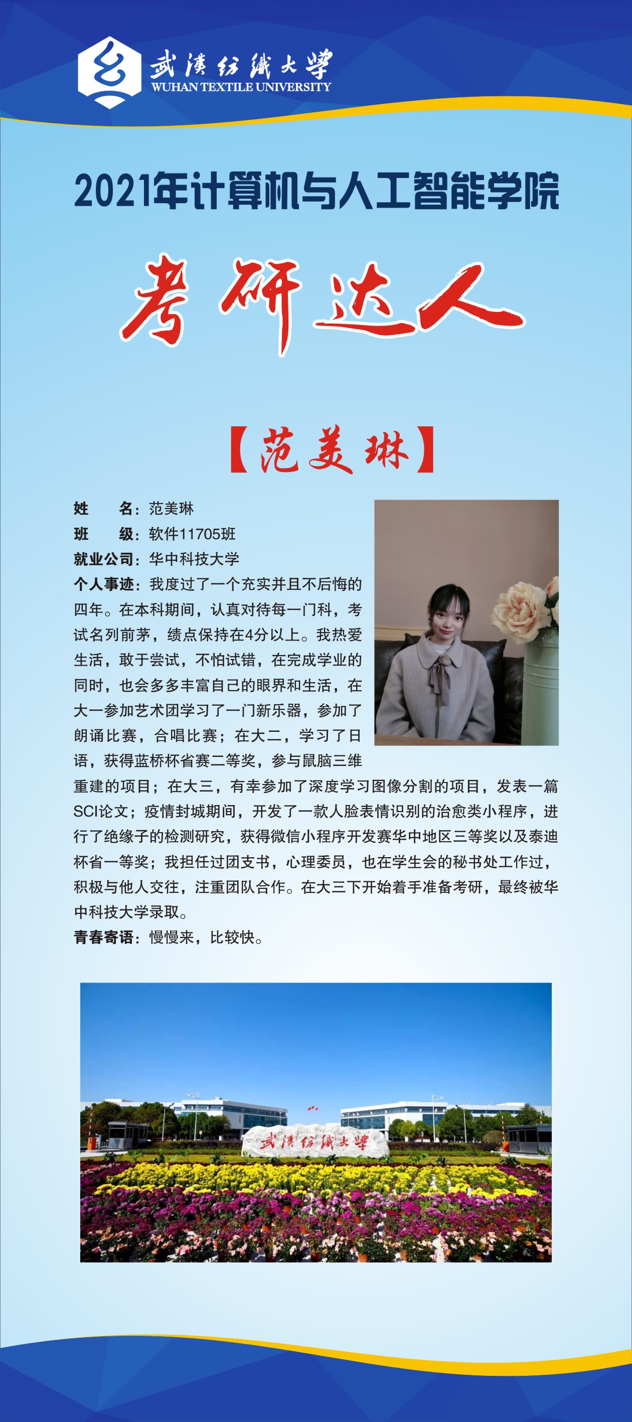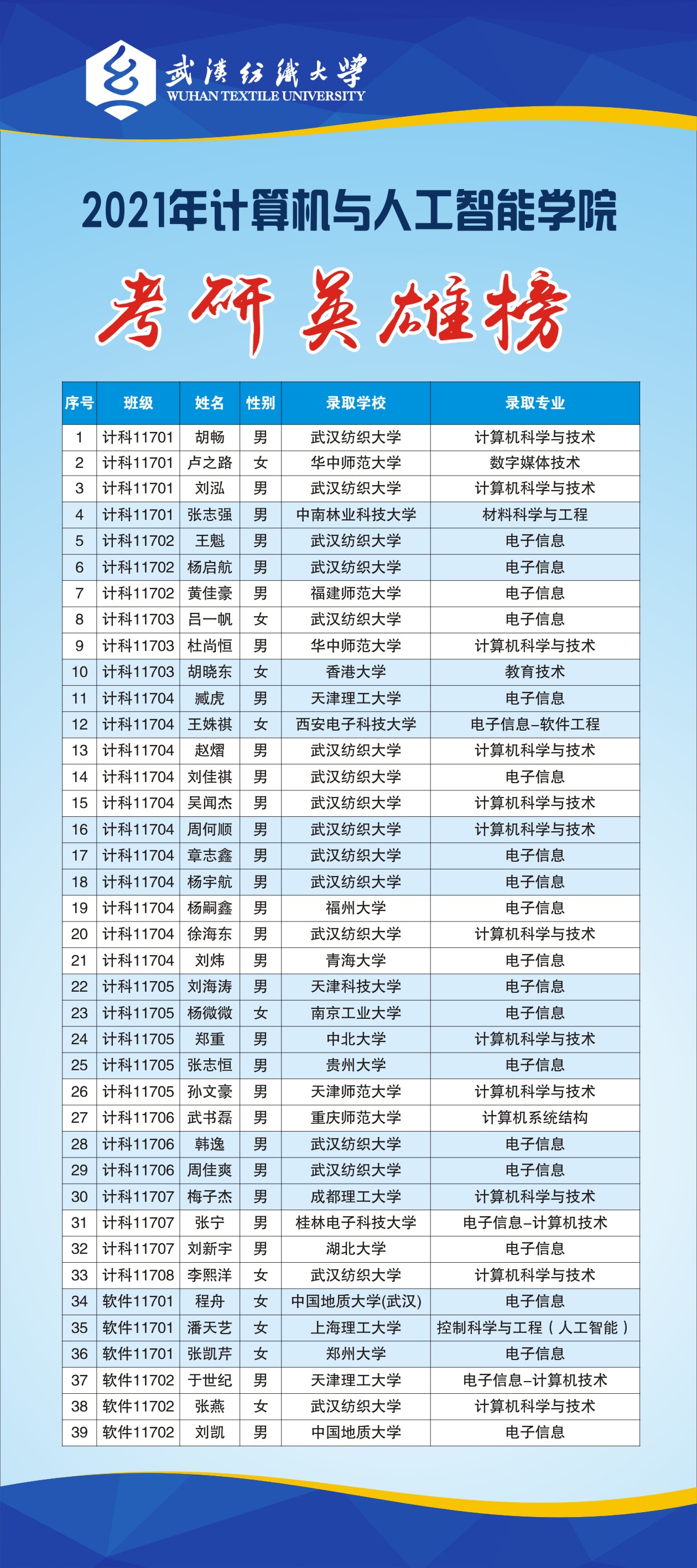 专业介绍:软件工程专业入选湖北省一流本科专业建设点,是湖北省战略新兴支柱产业人才培养试点专业本专业面向软件行业,本专业采用以项目为背景的教学方式,“三位一体”的育人模式,贯彻面向岗位、面向综合素质、面向个性化的三个面向原则,培养具有扎实的计算机软件理论知识、熟练掌握软件工程领域前沿技术和软件开发方法,具备规范的软件设计、开发、测试和项目管理能力,具有较强的实践能力和创新精神,良好的组织与交流能力,能够按照工程化方法从事软件项目开发和管理的专业技术人才。现有专任教师17人,其中湖北省“百人计划”1人,武汉市“黄鹤英才计划”1人,高级职称8人,其中具有博士学位11人、5人有海外留学经历,4人具有海外博士后研究经历。
