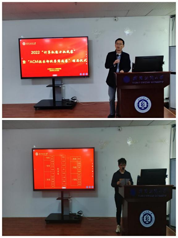 随后,由ACM俱乐部负责人雷宇涛和学术科技部负责人朱大伟分别宣读了“ACM俱乐部秋季筛选赛”和“新生计算机能力挑战赛”的获奖名单,并邀请魏雄和彭涛分别为获奖同学代表颁奖。