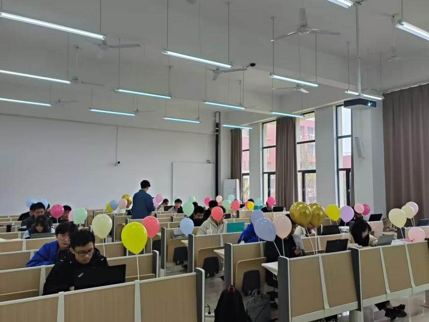 此次比赛不同于以往比赛的形式,本次比赛采用过题发气球的新模式来增加比赛的趣味性,即同学们通过一个题目之后就可以获得一个气球,通过题目越多得到的气球越多。与此同时,每道题目第一个写出来的同学可以获得一个独特金色气球。
