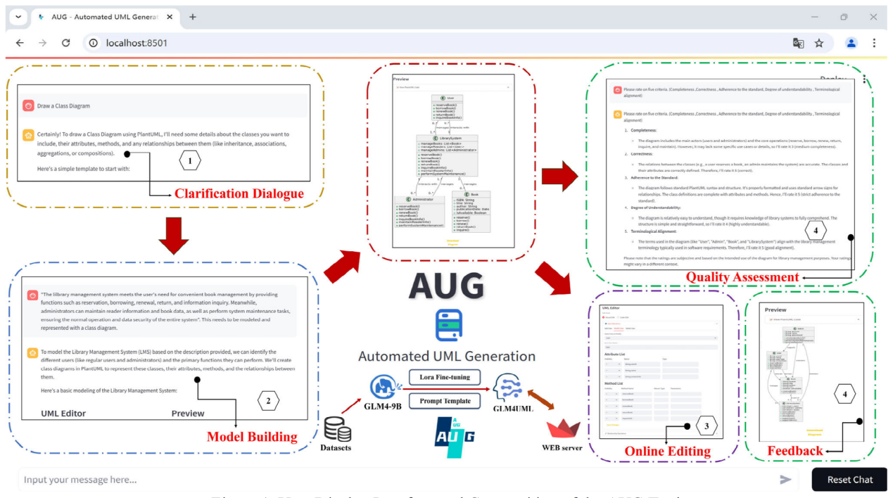 卢佳同学的论文《AUG: An Interactive Tool for Clarifying and Generating UML Models Based on Large Language Models》指出:需求建模在软件开发中至关重要,然而手动开展UML建模活动既耗时又容易出错。现有的基于大语言模型(LLM)的方法通常依赖PlantUML解析等间接手段实现,导致其适应性不足。为应对这些挑战,该学生团队研发了一款名为AUG(Automated UML Generation)的工具。该工具是一款由GLM4UML模型驱动的交互式工具,专注于自动化UML建模,尤其适用于类图、用例图和序列图的生成。AUG集成了动态编辑、质量评估与反馈机制,构建了一套自动化评估与优化范式。通过构建包含10000条数据的数据集,并采用提示学习技术对GLM4-9B进行微调以提升模型性能。实验结果表明,AUG的精确率、召回率和F1值分别达到78.68%、67.37%和72.59%,优于四种开源大语言模型(比较基线)。此外,该篇论文通过问卷调查进一步验证了AUG的高可用性与高效性,并展现了用户的高满意度。