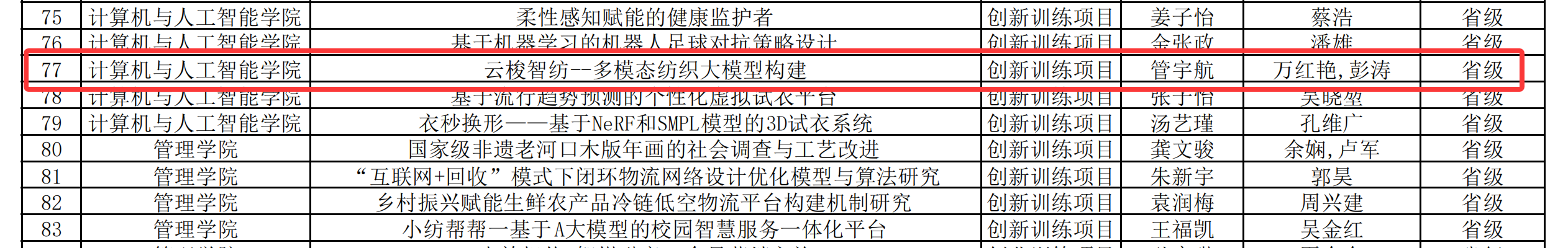 6月12日,学校创新创业学院公布了2025年大学生创新创业训练计划的获批项目清单,本年度获批项目总计170项,其中国家级30项、省级90项、校级50项。由ok138cn太阳集团5292024级“拔尖创新班”管宇航、刘攀、黄汪洋等同学组成的学生团队,所申请的项目《云梭智纺--多模态纺织大模型构建》成功获批省级立项,该项目的指导老师为副院长彭涛教授和万红艳老师。