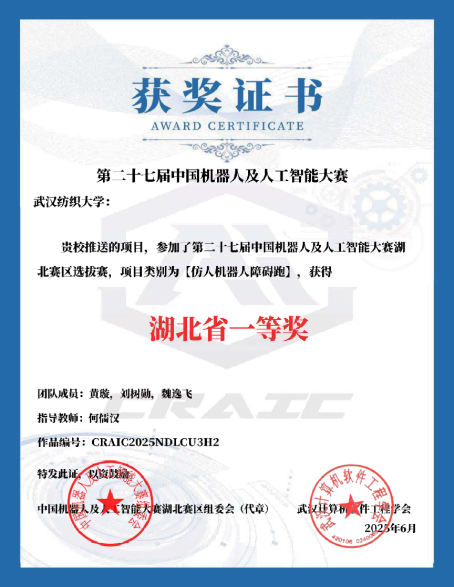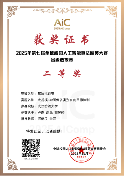何儒汉教授深耕科创育人,指导学生团队屡创佳绩:其带领的学生团队凭借赛题《大规模 SAR 图像多类别有向目标检测》,在 2025 年第七届全球校园人工智能算法精英大赛省级选拔赛中斩获二等奖;同时,他指导的学生团队在第二十七届中国机器人及人工智能大赛湖北赛区选拔赛中表现突出,一举夺得湖北省一等奖。