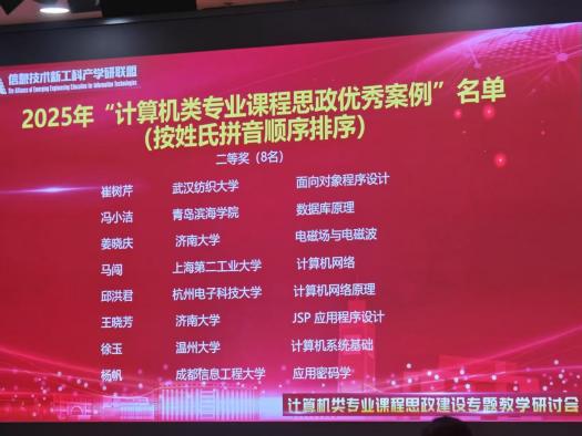 在课程思政建设方面,课程团队将家国情怀、科学精神、工程伦理等元素有机融入程序设计教学的全过程,潜移默化引导学生厚植科技报国的理想信念。课程团队负责人崔树芹主持申报的《面向对象程序设计》课程思政案例,在 2025 年中国软件行业协会信息技术新工科产学研联盟组织的 “计算机类专业课程思政优秀案例” 遴选中脱颖而出,荣获二等奖。此外,由她设计的 “代码赋形,创意无限:C++ 图形学之旅” 实训案例,也在 2025 全国程序设计大会(PECC)上斩获程序设计类实训案例二等奖。