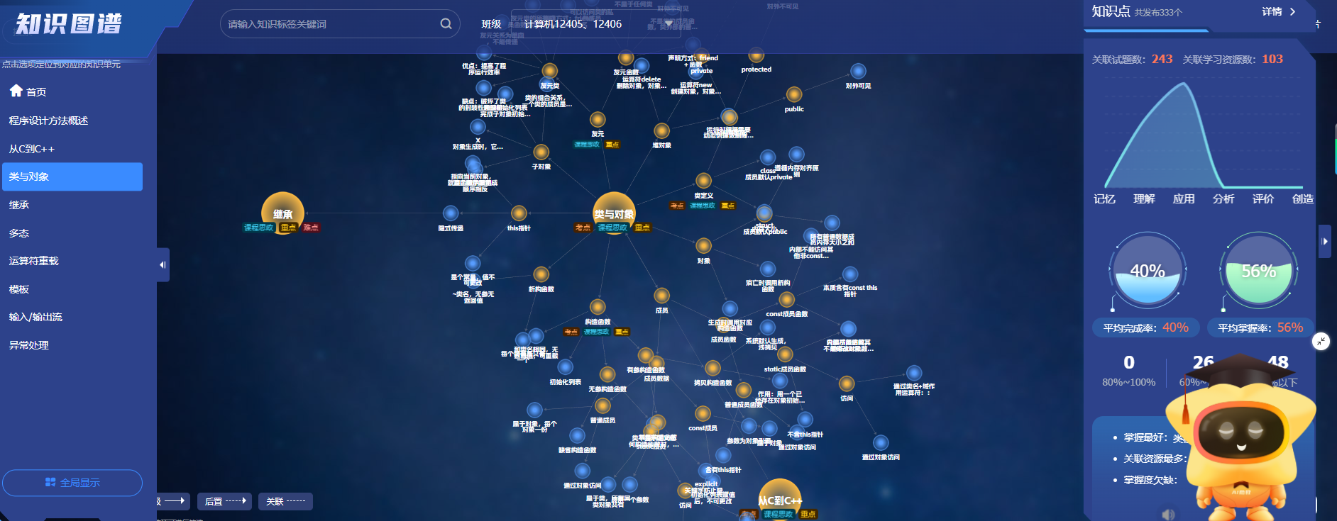 智慧教学建设是团队课程建设的重中之重,超星泛雅平台的定制化搭建提供关键支撑。团队精准构建四大核心模块:知识图谱系统梳理类与对象、继承与多态、封装与抽象等核心知识点的逻辑关联,帮助学生搭建系统化知识框架;能力图谱对标行业岗位需求与课程培养目标,明确从基础编程到项目开发的阶梯式能力要求;思政图谱深度挖掘课程中的科技报国、精益求精等思政元素,实现思政内容与专业知识的精准衔接;任务引擎则基于学生学习数据动态推送个性化编程练习、项目实训等任务,打造自适应学习路径。借助超星泛雅平台AI平台精准捕捉学生学习动态,动态调整教学策略,形成“课前预习有引导、课中互动有载体、课后巩固有反馈”的智慧教学闭环,有效降低学生学习难度,课程满意度显著提升。