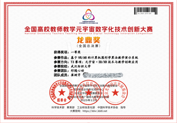 课程团队深耕教学内容与方法创新。课程负责人崔树芹精心设计的智慧教学案例和实验案例在第七届中国计算机教学大会上分别荣获二等奖。其研发的《基于 VR/AR 的计算机图形学算法教学演示系统》,更在全国高校教师教学元宇宙数字化技术创新大赛中脱颖而出,斩获全国决赛一等奖。黄俊杰博士以“广西盘龙矿地质勘探多源数据三维可视化” 科研项目为核心,将科研成果转化为优质教学资源,通过系统化的教学改造与适配,助力学生掌握核心技术、提升创新能力。教学实施以 “掌握三维可视化全流程,理解数据融合与渲染效率的平衡,实现地质体三维建模与交互探索” 为核心目标,同时延伸创新维度 —— 融合机器学习实现地质异常体自动标注,对接大学生创新创业项目,培养学生科研创新思维。