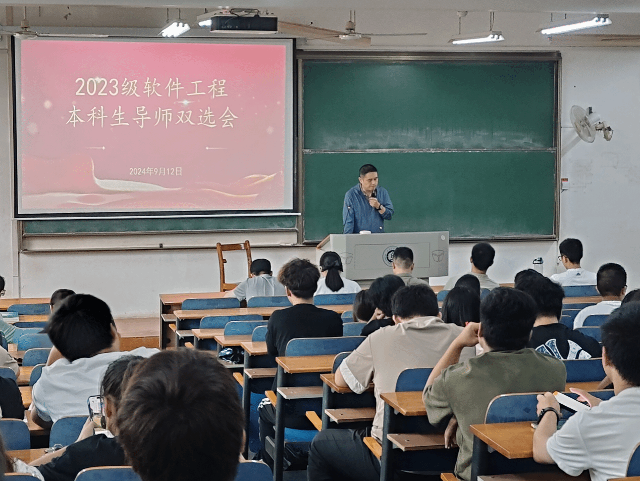 2024年9月12日下午,由ok138cn太阳集团529软件工程系主办的本科生导师双选会在崇志楼118教室举行。软件工程系主任叶鹏、软件工程系部分专任老师、辅导员易凡及全体2023级软件工程系学生参会,系主任叶鹏主持会议。